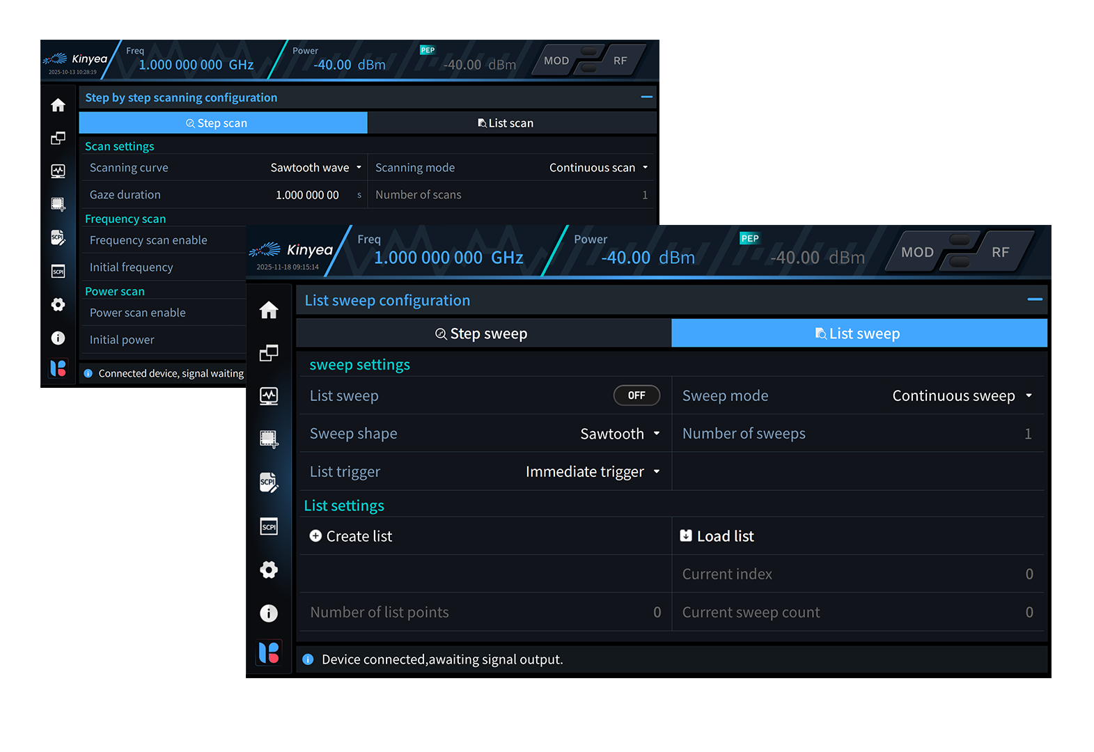 kyMCSG supports two sweep modes: Step Sweep and List Sweep. In either sweep mode, the sweep can be performed with a Sawtooth or Triangle shape, in either Continuous or Single execution mode.