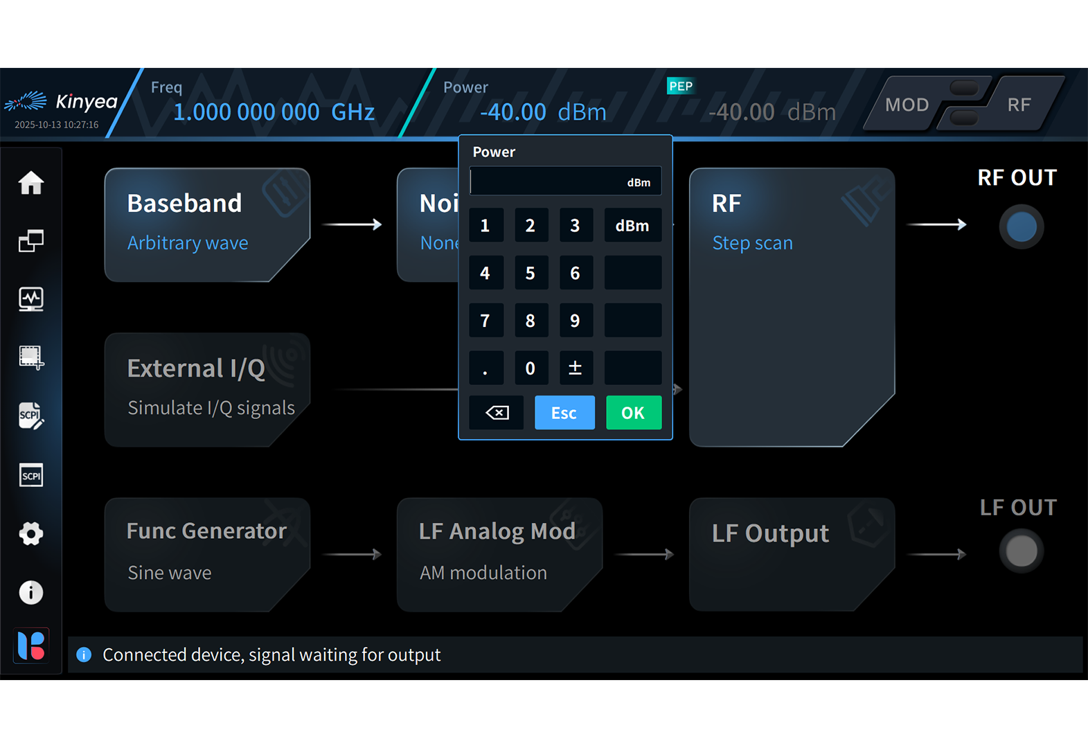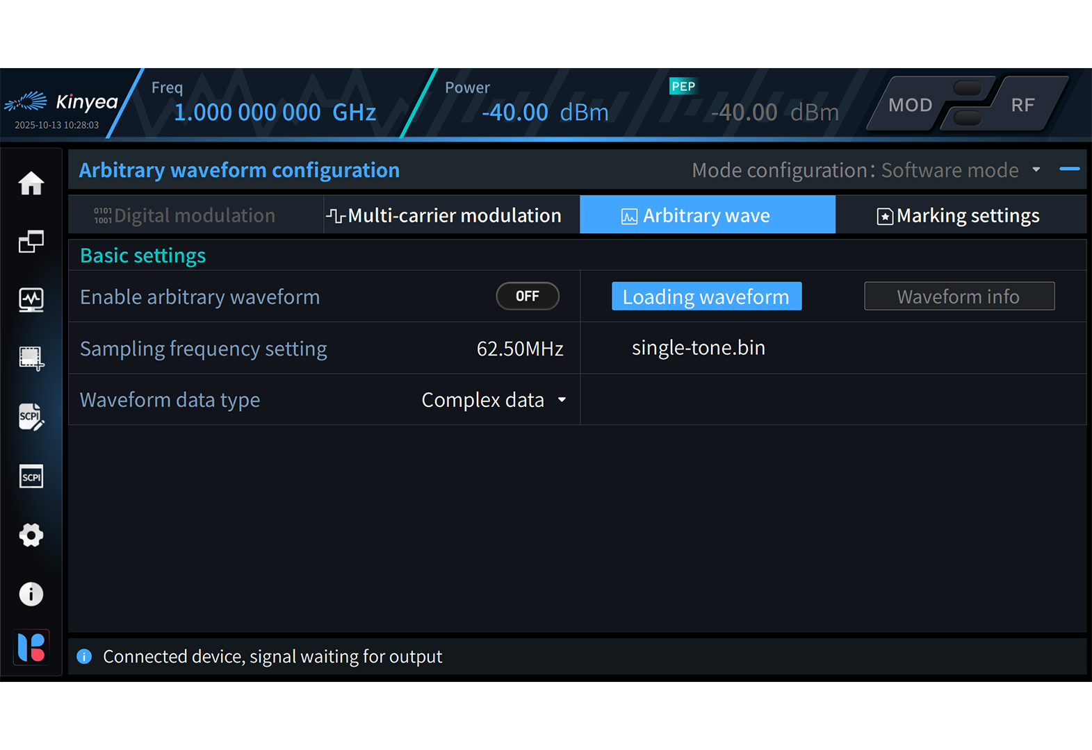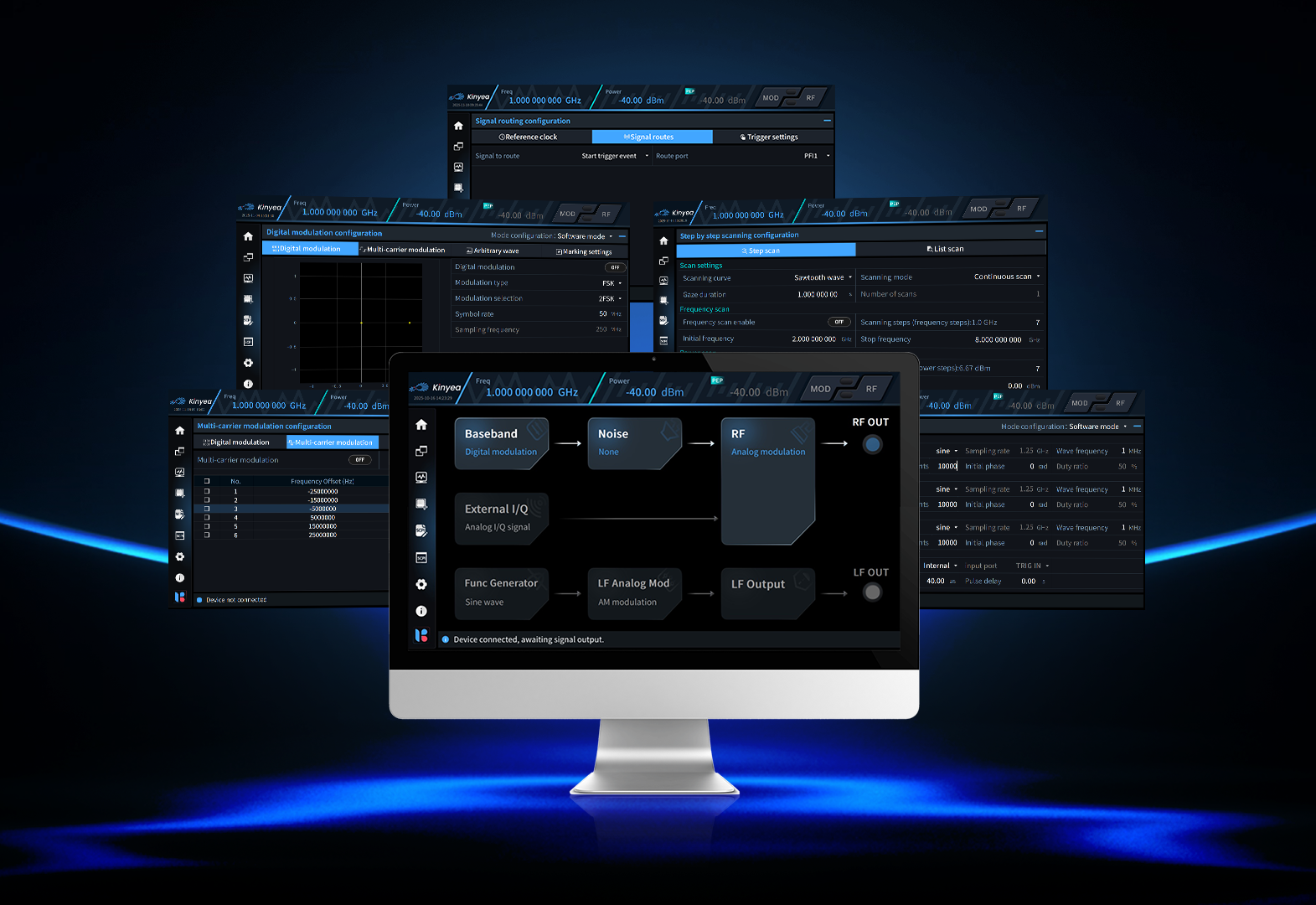 kyMCSG is the standard, pre-installed application for WSA and WST series products as-shipped configuration. kyMCSG can configure wideband signal-generation MARSA® modules and MARSA® instruments to output a rich variety of RF signals. It also works as the MARSA® Operation System (kyMOS) for installing the rich suite of powerful kySP (Kinyea Signal Packet). The kySP covers more advanced signal generation functions oriented towards both signal characteristics and application scenarios. Advanced signal generation functions for signal characteristics include general modulated signal generation, analog modulation, pulse modulation, and more. Advanced signal generation functions for application scenarios include communications/ avionics/ GNSS/ radar/ data link signal generation, multi-channel concurrent generation, and large capacity data playback.