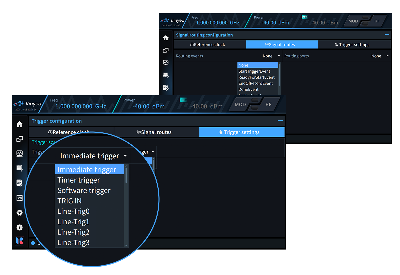 kyMCSG can provide rich and flexible event signal routing functionality, enabling the routing of internal functional events from the signal generator (signal source) to different physical ports. kyMCSG supports configuration of multiple trigger sources including immediate trigger, timer trigger, software trigger, and external trigger, along with trigger edge and trigger delay configuration.